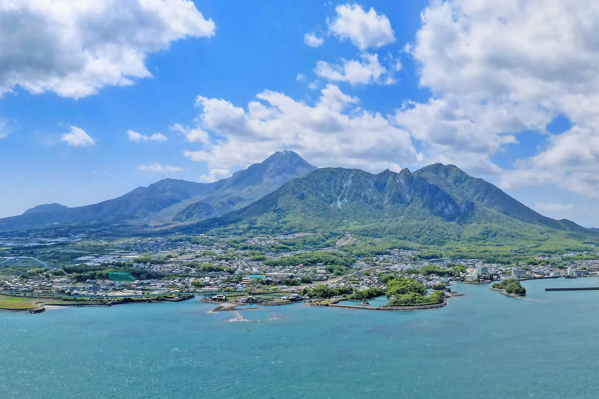 島原湾から望む島原半島。海と山の間に肥沃な大地が広がる美しい半島だ(画像/島原市)。