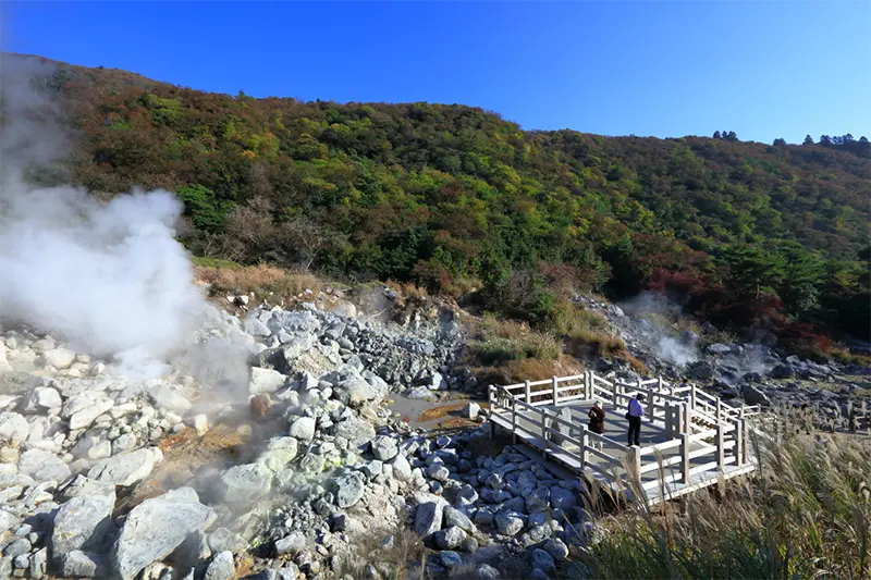 雲仙岳が活火山だからこそ、至るところから大量に湯煙が立ち上る「雲仙地獄」。ユネスコ世界ジオパークらしい大地の鼓動を感じられる貴重な場所だ。
