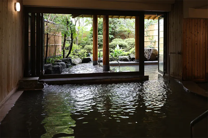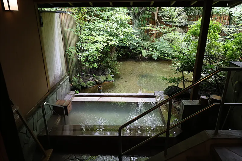 婦人大浴場「佳宵の湯」。内湯につながる露天風呂は日本庭園を望む。第三源泉をかけ流した硫黄泉のお湯は、濃度が高いのにとても柔らかな肌あたり。つるんとひと皮向けたような肌の蘇りを感じた。