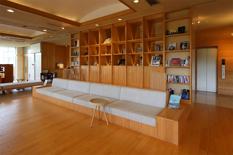 ブックラウンジのソファで、読書のひと時を楽しみたい。背後には雲仙檜で作られた書棚が。