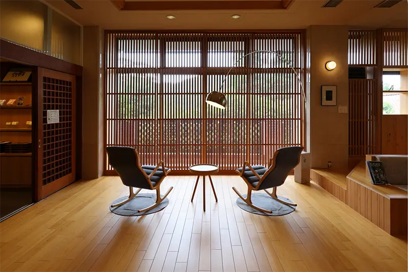 若女将は長年、東京の外資系企業のマーケティング部門で活躍していたが、先代が急逝した2020年、雲仙に戻り家業を継承することになったという。ちょうどコロナ禍だったこともあり、宿のコンセプトを練り直し、「国立公園内にある、自然との共存」をテーマに、雲仙檜を使ったリノベーションとSDGsの取り組みに着手。檜の床材が張り巡らされたモダンなブックラウンジには、座り心地のよいソファやロッキングチェアが配されている。