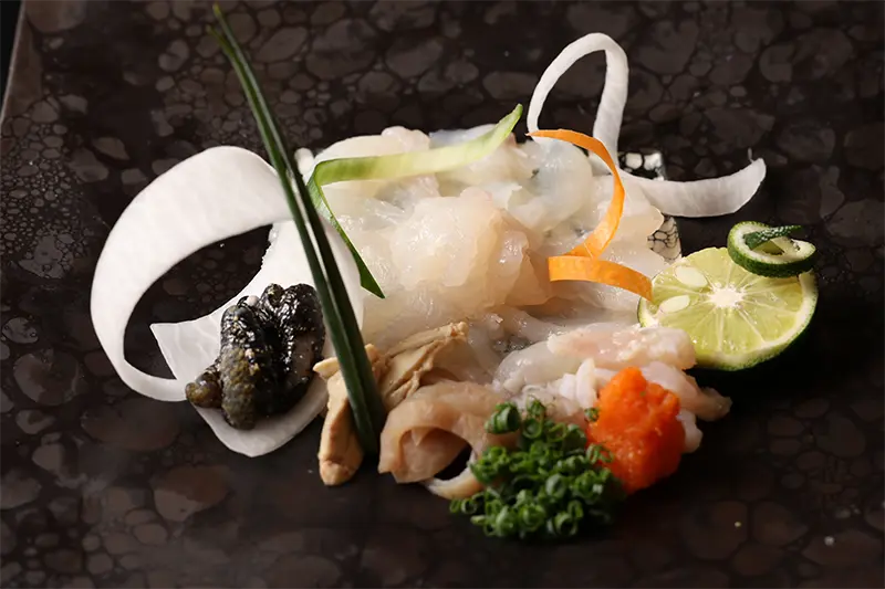 見た目の迫力に反して、上品な味わいの高級魚、虎魚(オコゼ)のお造り。ぷりぷりとした食感から、抜群の鮮度と包丁さばきの技が伝わってくる。