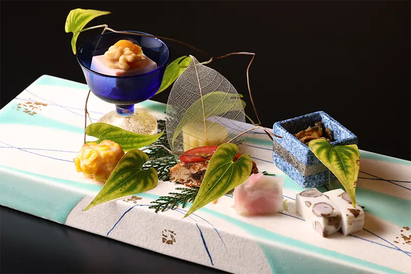 厚みのある長皿に並ぶ色とりどりの八寸。吟味された地元食材を華やかな器が引き立てる。