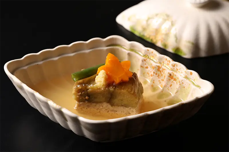 珍しいひし形の蓋物の中には、しっとりとした茄子豆腐が。