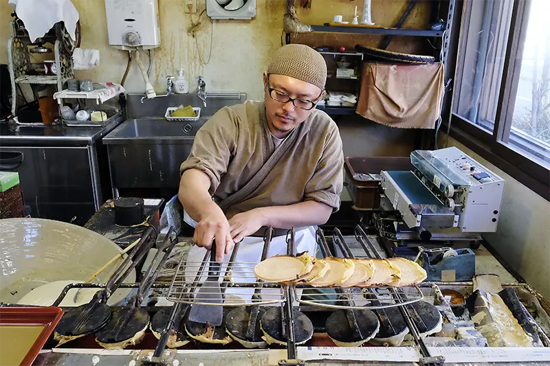 1枚ずつ手焼きする加藤さん。明治中期に宿として創業し、戦後、土産物店になってから湯せんぺいを焼き始めて70年以上という「遠江屋本舗」。