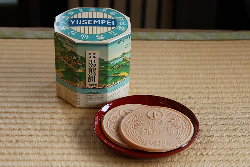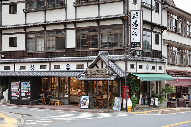 温泉神社の目の前にある「雲仙温泉 遠江屋本舗」は、「雲仙湯せんぺい」の伝統を守る店。塩味のある温泉水を用いた生地を、一枚一枚手焼きしているのは、もうここ一軒しかないと店主の加藤隆太さんからうかがった。サクサクとした食感の湯せんぺいは、昔から胃腸にもよいと湯治客に人気だったというのも頷ける優しい味わいだ。