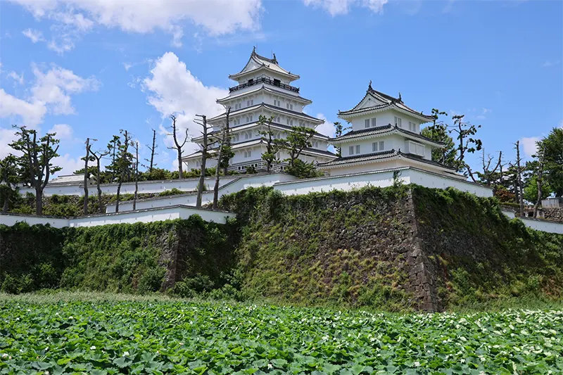 島原市のシンボル、島原城。白く輝く5層の天守閣の最上階まで登ると、周辺の景色が一望できる。