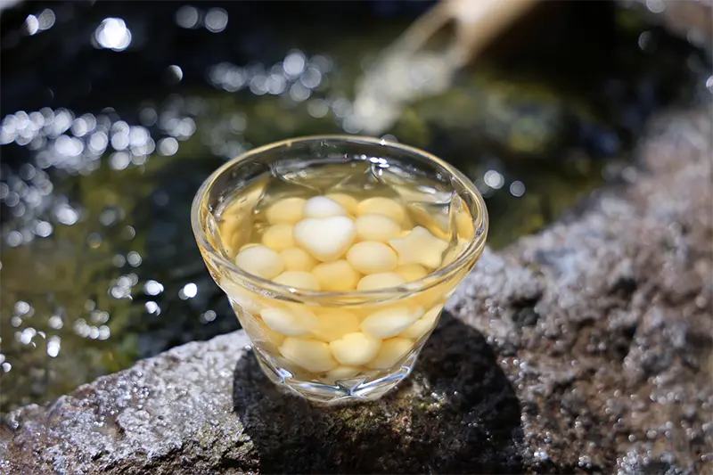 「しまばら湧水館」内の湧水を使って作る「かんざらし」。ツルッとした白玉とさらりとした蜜は、清らかな水の賜物。